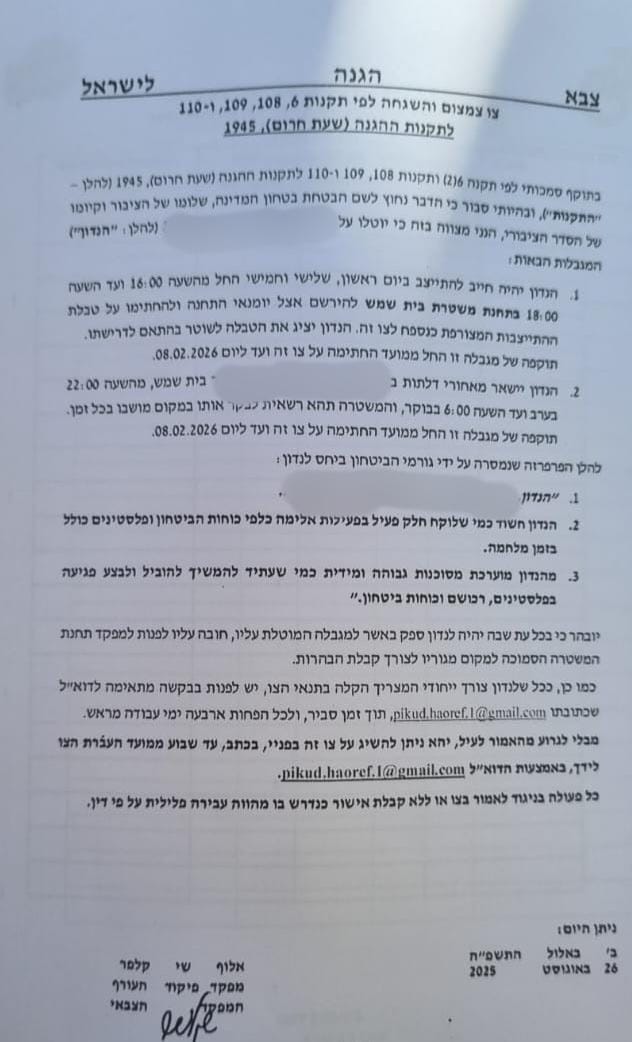 Monday, September 22, 2025, 13:48 A matter of hours before the onset of Rosh HaShana, police officers served a 23-year-old Binyamin resident with an administrative order signed by the GOC of the Home Front Command, Major-General Shai Klapper. The order places the resident, whose parents live in Kochav HaShahar, under nighttime arrest in Beit Shemesh. The resident must also sign in three times a week in the afternoon at the Beit Shemesh Police Station.