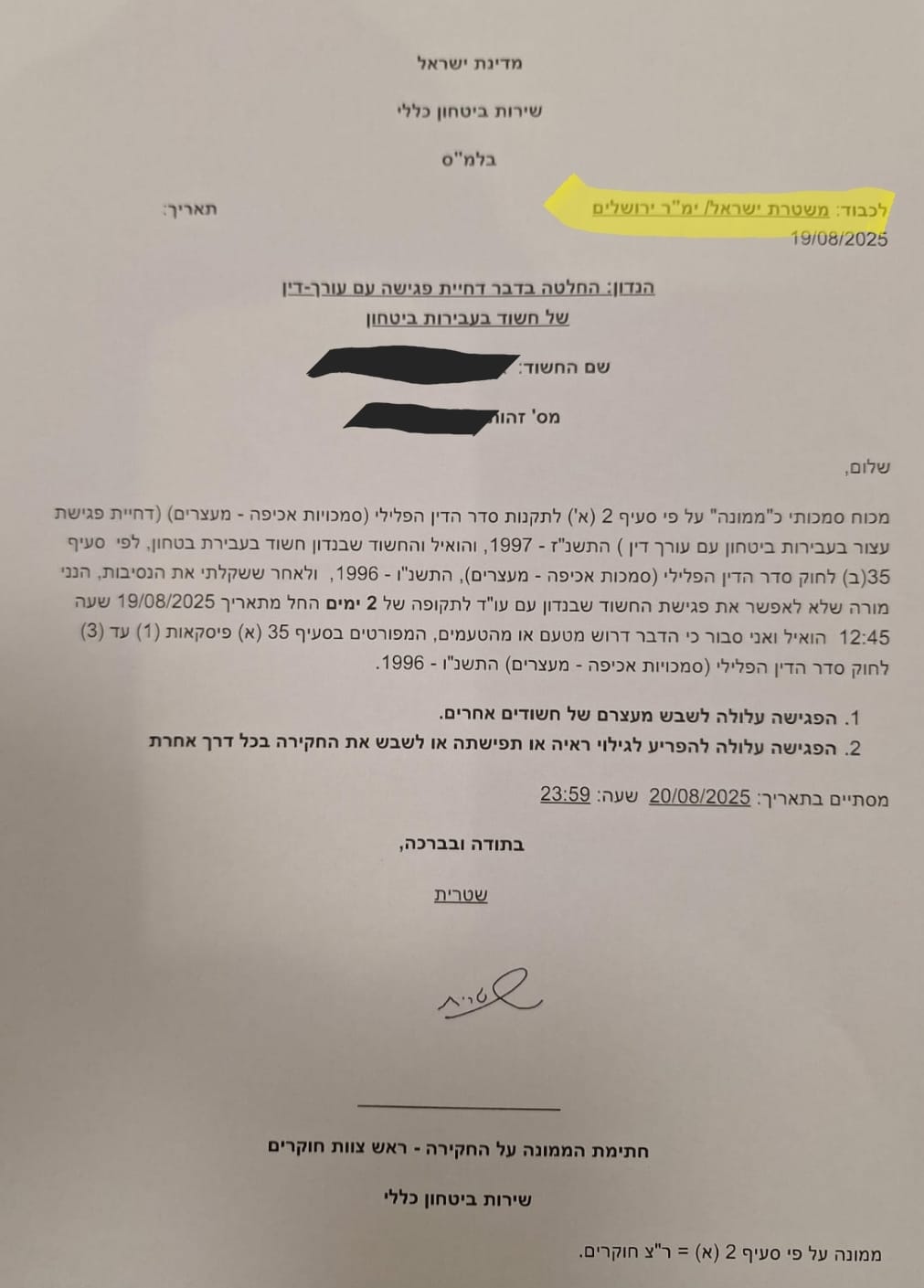 Monday, August 25, 2025, 18:39 Last Tuesday, the GSS detained two Binyamin residents, one of whom is married and has children. They were taken to a GSS facility, where they underwent harsh interrogations. During most of their remand, they were denied their right to meet with an attorney (see also here). They met with Honenu Attorney Asaf Gonen only yesterday (Sunday), after being detained for six days. Honenu Attorney Daniel Shimshilashvilli is also representing the detainees.