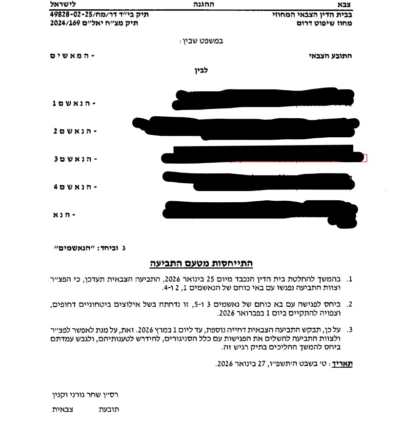 Wednesday, January 28, 2026, 16:17 The President of the Military Court, Colonel Meir Vigisser, granted a request by the Military Advocate General to postpone a hearing for the IDF Unit 100 soldiers indicted in the Sde Teiman case on suspicion of assaulting a Nukhba terrorist prisoner who took part in the Simhat Torah massacre (October 7). The hearing that was scheduled for this week was postponed for a month due to the need for additional meetings between the recently-appointed Chief Military Advocate, Major-General Itai Ophir, and the soldiers’ attorneys.